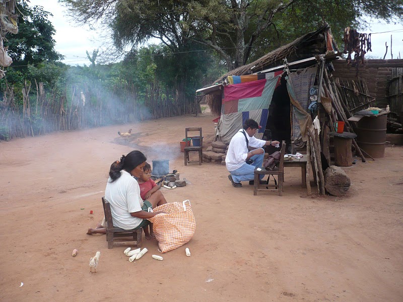 La enfermedad del mal de Chagas se ubica principalmente en las zonas rurales pobres latinoamericanas. En la foto, comunidad guaraní del Chaco Boliviano, con un técnico de Inesfly. Foto: Rosa Castro